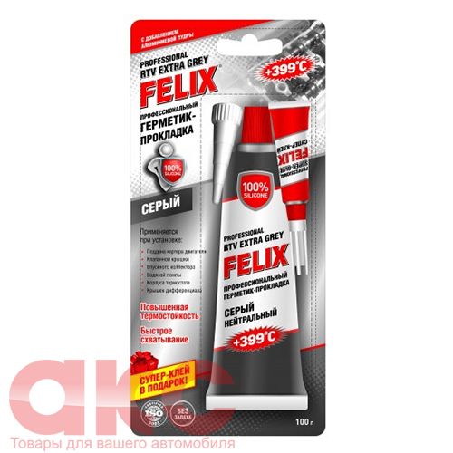 Герметик-прокладка FELIX (серый) 100г - В состав продукта входит алюминиевая пудра, позволяющая применять герметик в условиях высоких температур или в сильно нагруженных соединениях, при проведении ремонта узлов и агрегатов трансмиссии и двигателя, при установке и ремонте поддона картера двигателя, клапанной крышки, впускного коллектора, водяной помпы, корпуса термостата, крышек дифференциала. Заменяет любые заводские силиконовые прокладочные материалы, штатные твердые и резиновые прокладки.