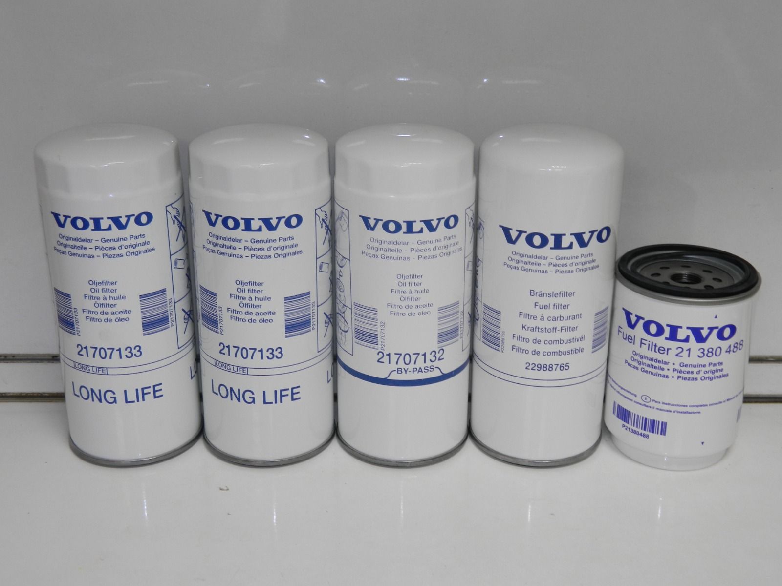 Комплект фильтров состоит из: № 21707133 (Фильтр масляный - 2 Шт.); № 21707132 (Фильтр масляный - 1 Шт.); № 22988765 (Фильтр топливный - 1 Шт.); № 21380488 (Фильтр топливный - 1 Шт.)